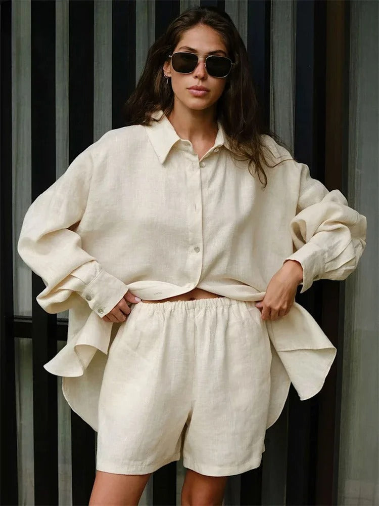 A woman in sunglasses and a beige linen 2 piece set stands before contrasting vertical panels. Her summer loungewear features an oversized button-up shirt and matching shorts crafted from lightweight fabric, with long brown hair and hands at her hips.