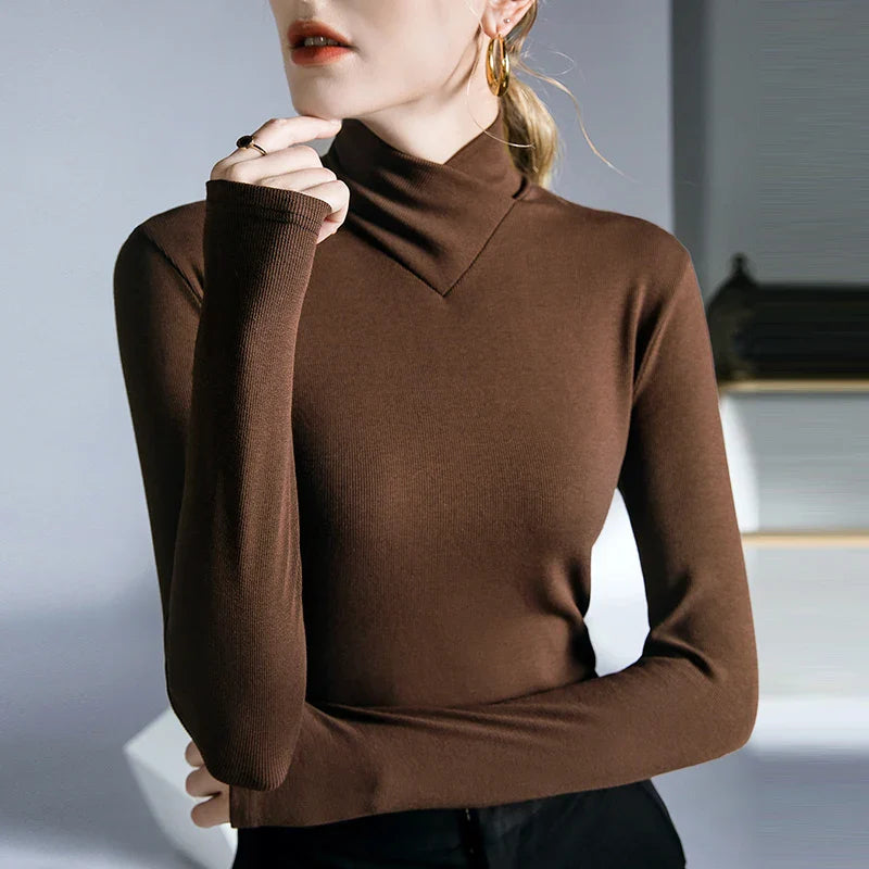 A woman wears a fitted, long-sleeve Stand-up Collar T-shirt in dark brown with a unique asymmetrical turtleneck, standing against a light-colored wall. Her face is partially out of frame, and she has shoulder-length hair. A true Fall/Winter Essential.